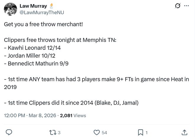 同时快船队全场3人至少获得9次罚球,也成为19年以来联盟首队,更是14年来快船队首次,上次还要追溯到格里芬、小乔丹和克劳福德时期。