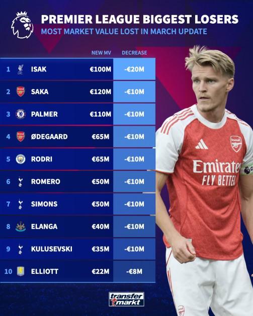 北京时间3月9日,德转更新英超身价。其中伊萨克下跌2000万欧来到1亿欧元,萨卡、帕尔默、厄德高、罗德里各下跌1000万欧。